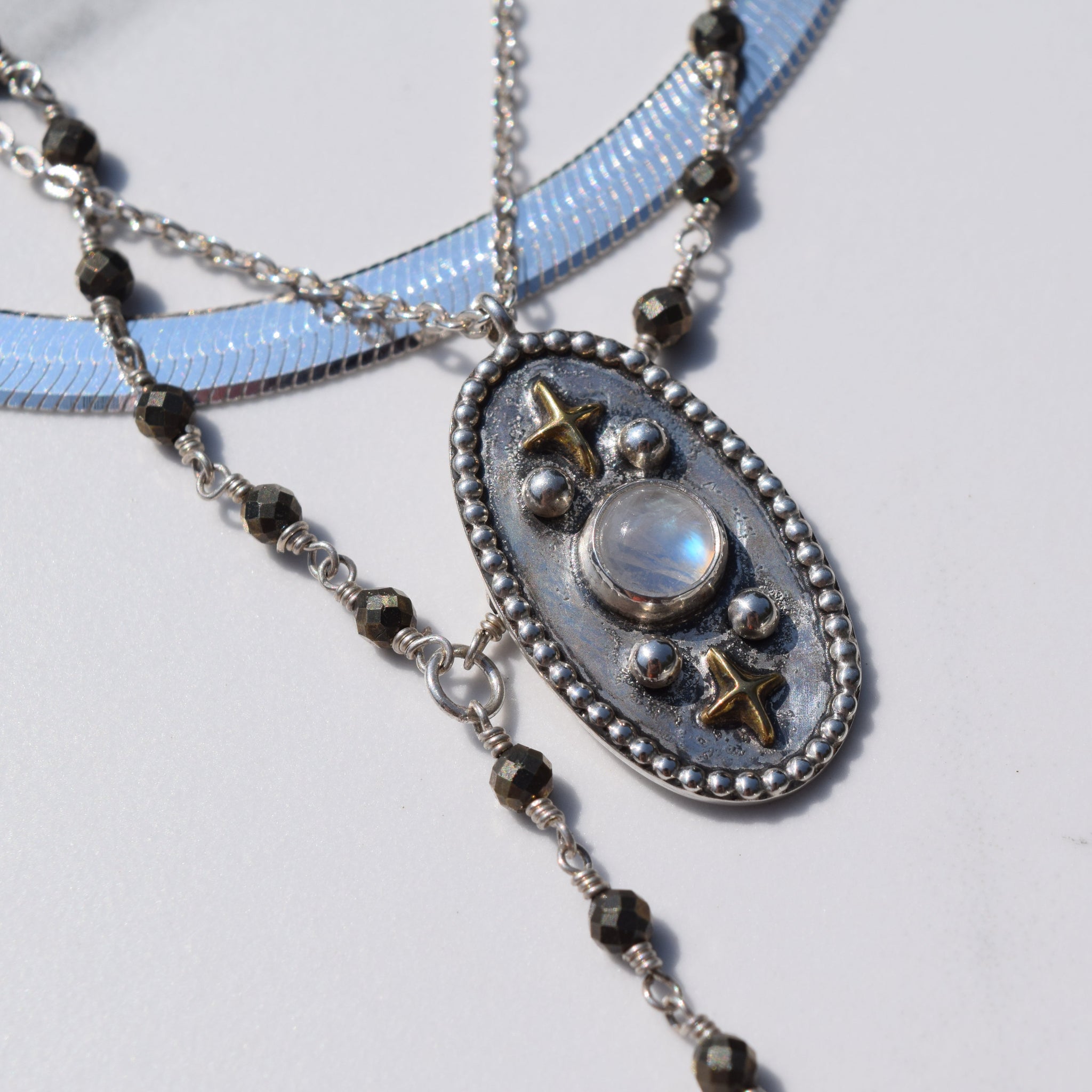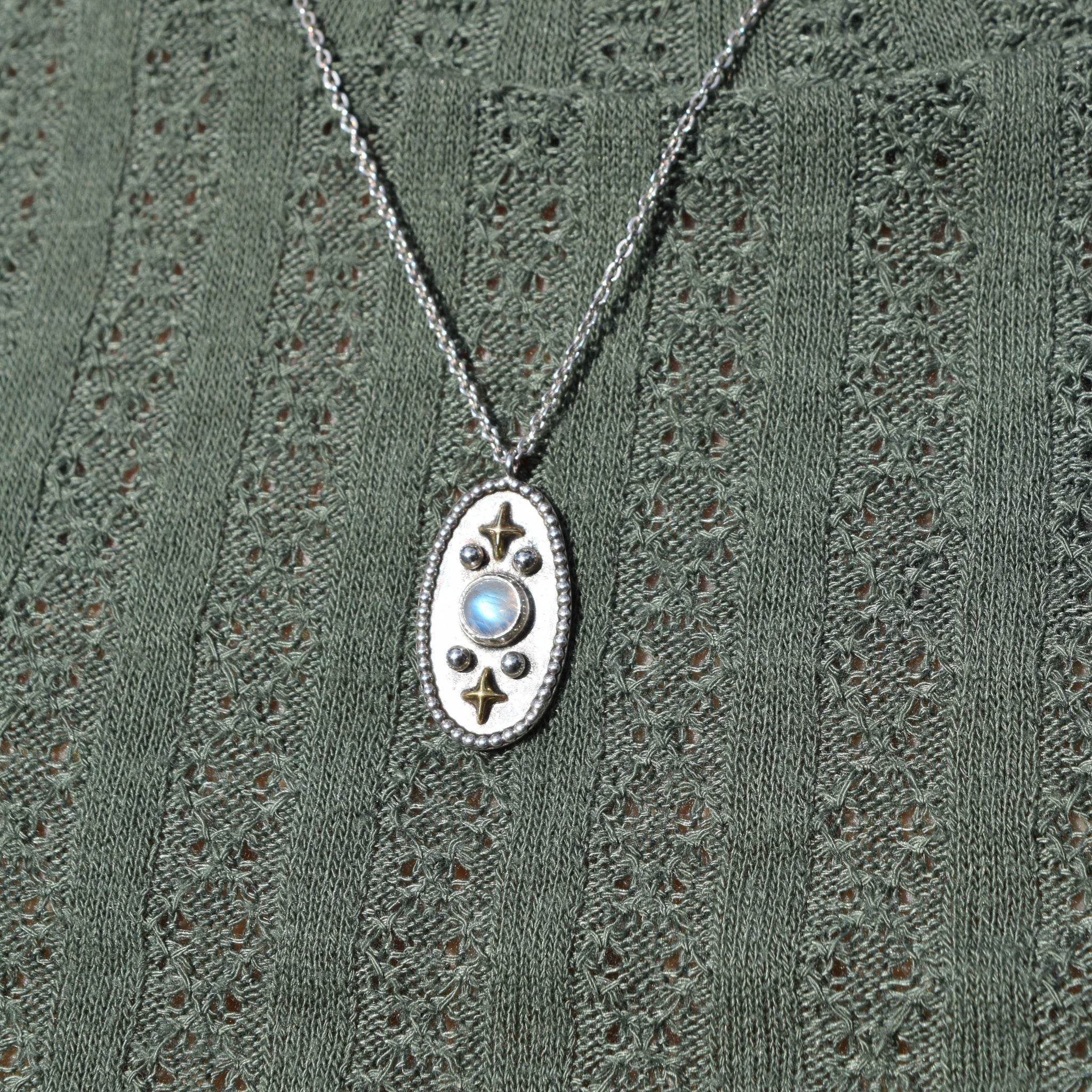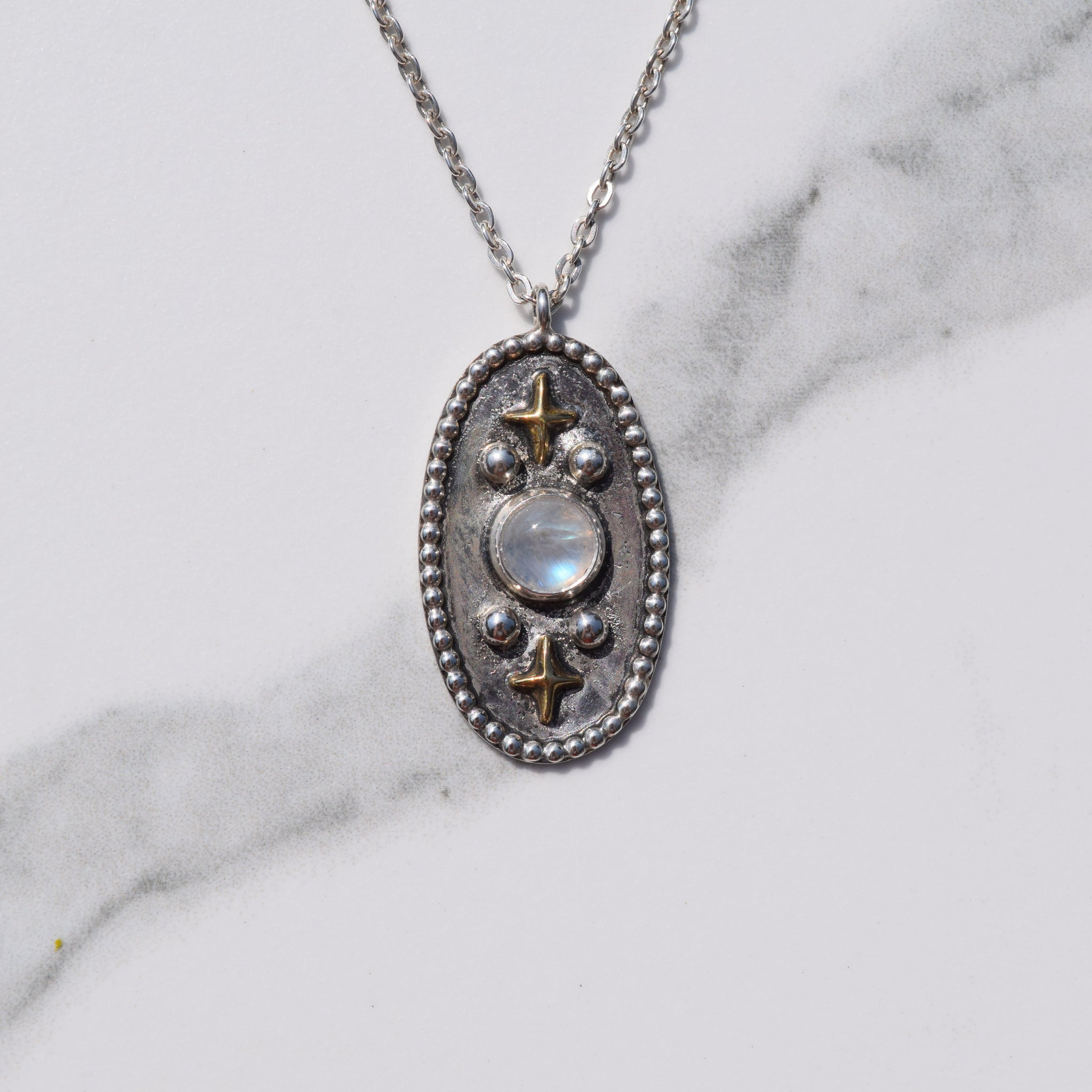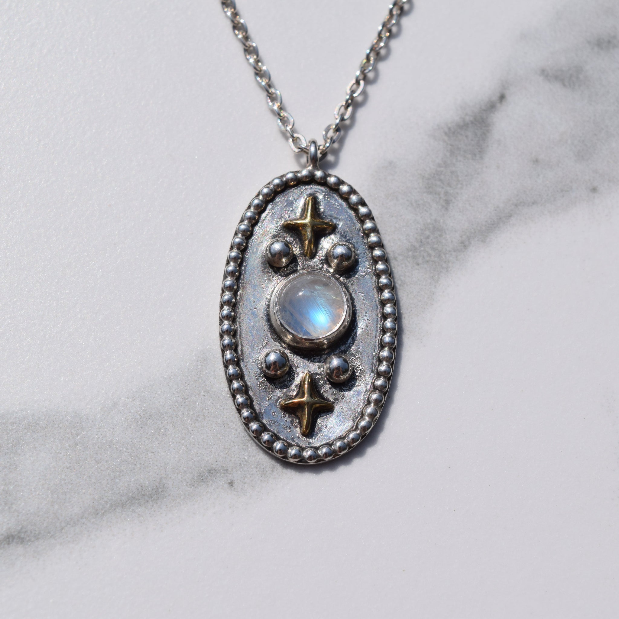 Embrace a touch of celestial magic with our handmade Moonstone Mixed Metal  Pendant. Crafted from a mix of sterling silver and brass, this enchanting piece features a luminous rainbow moonstone that shimmers with ethereal light. Delicate brass stars adorn the top and bottom of the pendant, adding a witchy, celestial sparkle framed by a dainty beaded border. Hanging from a fine cable chain, this pendant is the perfect blend of elegance and mysticism. Whether worn alone or layered, the Moonstone Star Pendant radiates dreamy, otherworldly charm.